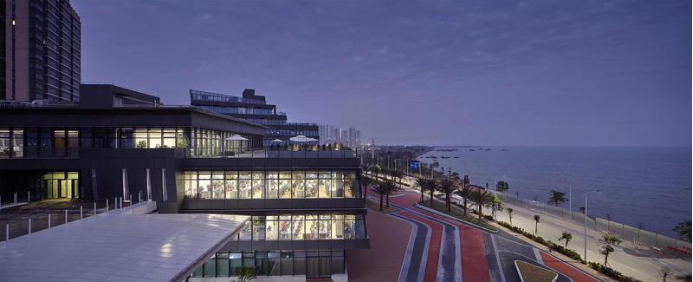 用于研發(fā)和辦公的1-5號建筑對軸扇形圓心向外引出的延長線,朝向海面依次排列在扇形外長邊上,是名副其實(shí)的海景辦公樓。2-5棟為兩兩對稱的四層長方形幕墻建筑,其中四層的建筑樓層平面后退、縮小,錯出了三層屋頂?shù)穆杜_,是最佳的觀海、休閑戶外場地。