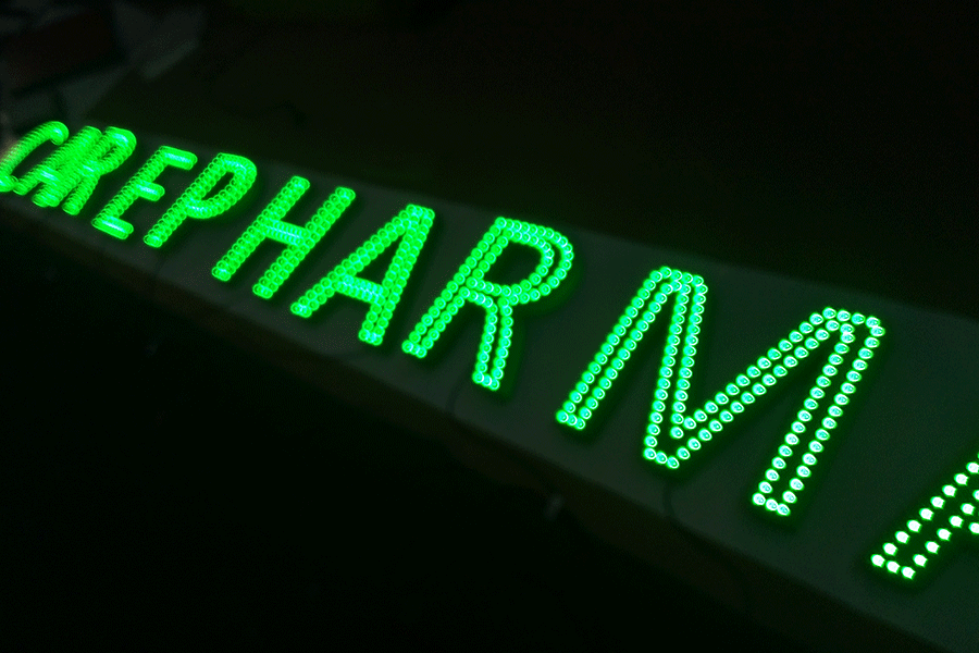 第2步,打孔處理。將鍍鋅板利用激光切割機切割成合適的板塊和邊條,字的正面板就利用沖孔機進(jìn)行打孔處理,孔的間距根據(jù)字的大小實際合理調(diào)整,孔的大小根據(jù)使用燈珠大小的直徑有關(guān)系。