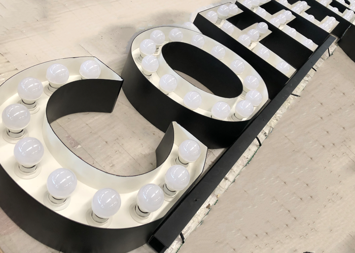 一種復(fù)古的工藝發(fā)光字,一般由金屬底座和包邊組成,光源則采用球形燈或鎢絲燈等,發(fā)光高亮醒目。