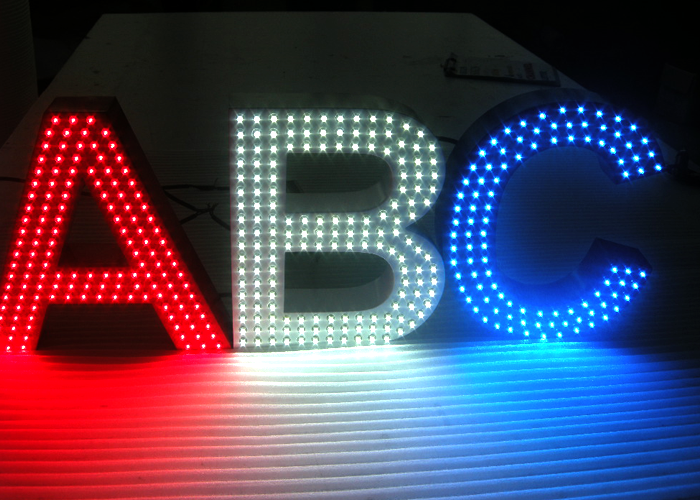 3、LED外露發(fā)光字:外露發(fā)光字按顏色分為單色,七彩,全彩發(fā)光字。單色LED發(fā)光字是由打好孔的字殼,和單色外漏燈組成。七彩外露發(fā)光字是由打好孔的字殼,和七彩外漏燈,七彩控制器構(gòu)成,打燈之后可以七彩漸變。全彩LED外露發(fā)光字由打好孔的字殼,和全彩外漏燈,全彩控制器構(gòu)成,利用專業(yè)軟件制作程序文件置入SD卡,SD卡插入全彩控制器,打燈之后外漏發(fā)光字,可以播放FLASH動畫,人物動畫,效果檔次極高。LED外露發(fā)光字合適使用在室外。