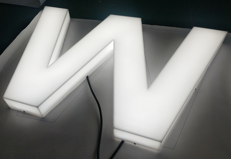 通體發(fā)光字夜晚字體明亮醒目(安裝一種新型的超亮度發(fā)光源,使用壽命長(zhǎng),使它隨亞克力板顏色發(fā)出耀眼的亮光)。立體感強(qiáng)(壁板放得越厚,立體感越強(qiáng))。色彩鮮明(各色亞克力板材任意挑選,壁板與面板顏色隨意組合)。