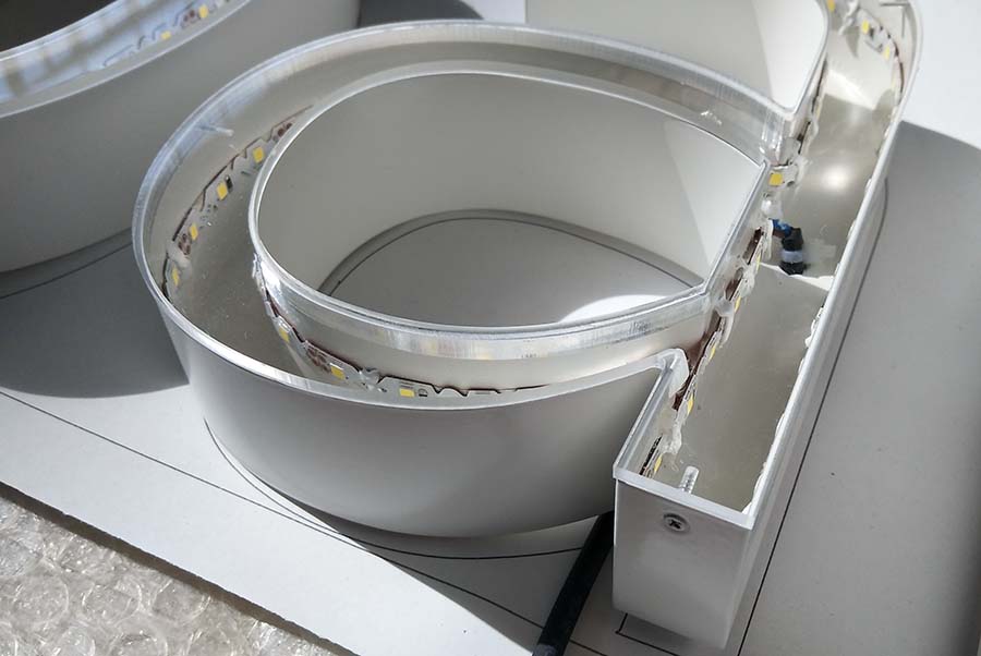 步驟3.裝進(jìn)LED燈:將LED燈裝進(jìn)底盒之中,但是在裝的時(shí)候要切記排線均勻,先考慮的是邊角比較深的部位,以防止打光不均衡,在裝完之后要記得打上玻璃膠加固位置。無(wú)邊發(fā)光字 西安發(fā)光字 發(fā)光字制作 發(fā)光字特點(diǎn)